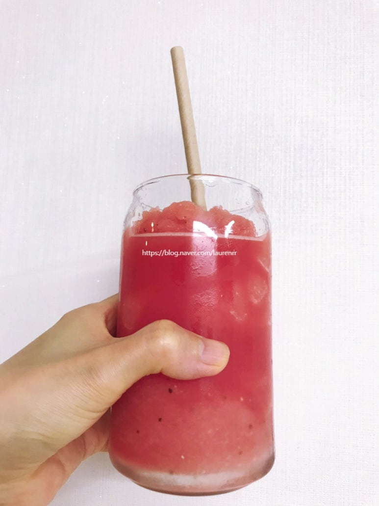 じゃーん!見た目にも爽やかな、美味しいスイカジュースが完成しました。