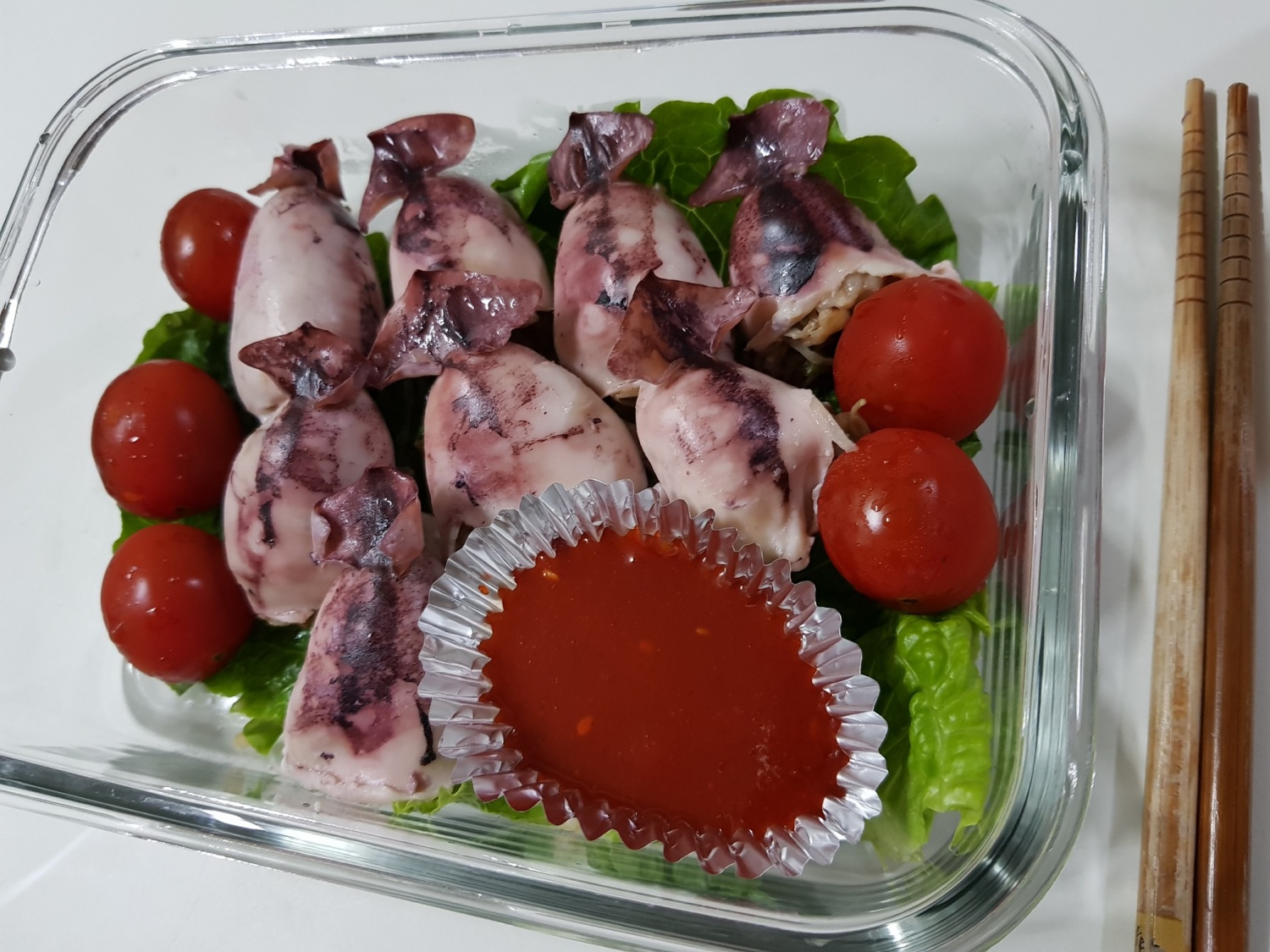 丁寧に蒸したイカの混ぜご飯詰めをお皿に美しく盛り付け、甘酸っぱいコチュジャンを添えて提供すれば、美味しい一食の完成です!お弁当のおかずとしても最適です。