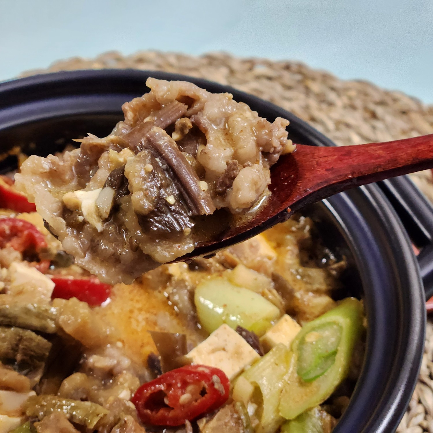 出来上がったチゲは、土鍋に移し替えて食卓でグツグツと煮立たせながらいただくと、さらに格別です。乾物自体にある程度の塩気があるので、テンジャンだけで味は十分な場合が多いですが、もし薄味に感じる場合は、だし醤油や塩をほんの少し加えて味を調えてください。香ばしいテンジャンとコクのある牛バラ肉、風味豊かな乾物の調和が素晴らしい、ご飯が進むチゲをぜひお楽しみください!