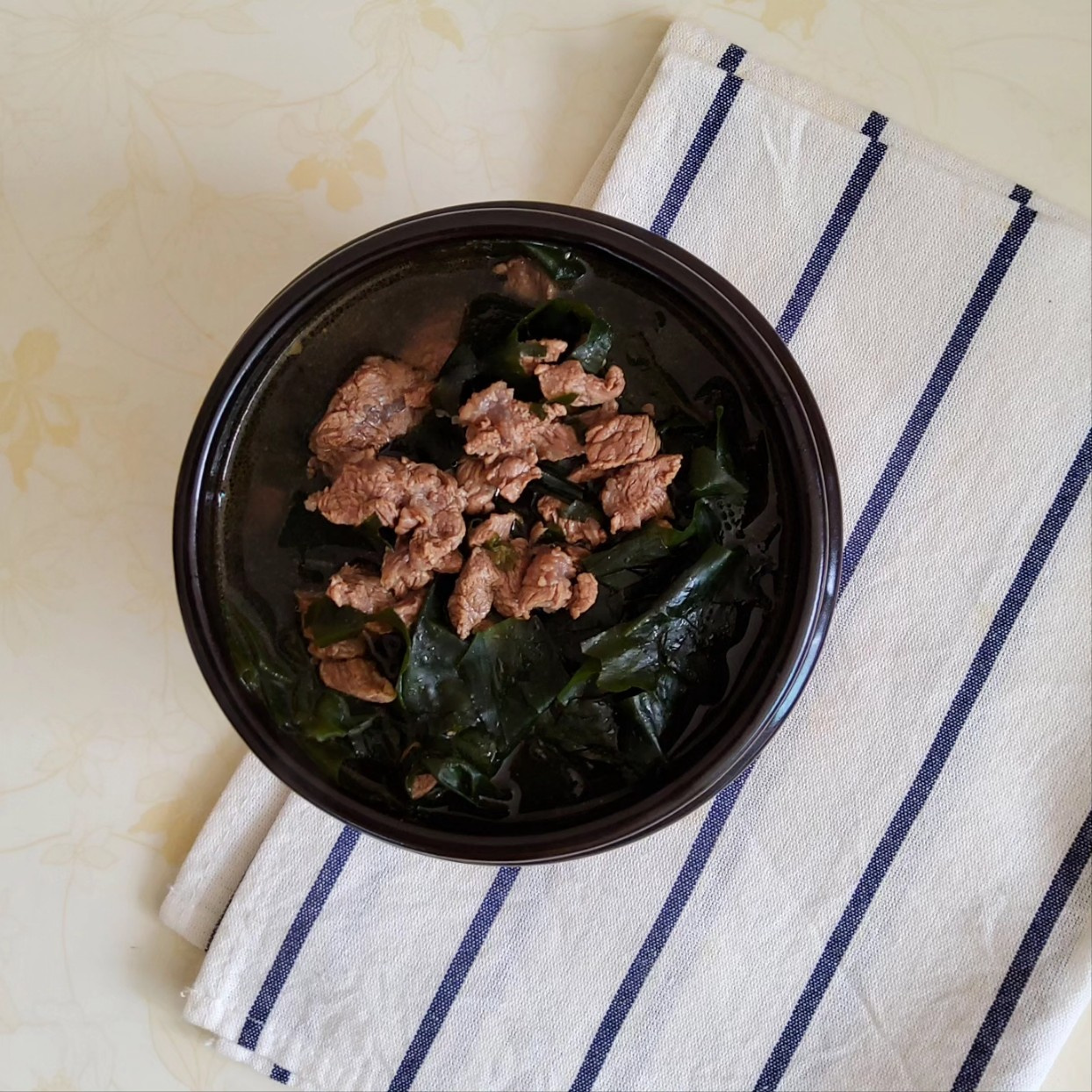 温かく栄養満点の牛肉わかめスープが完成しました!器に盛り付けて、美味しくお召し上がりください。ご飯と一緒にいただけば、満足感のある一食に、また、お客様のおもてなし料理としてもぴったりなメニューです。