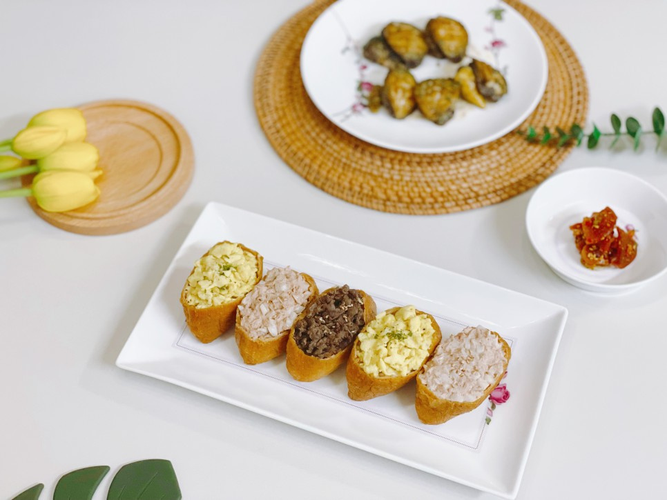 お仕事のお弁当やピクニックにぴったりのいなり寿司! 풀무원(プルムウォン)の「大きな四角い油揚げ」キットを使って、有名店「度会」風に様々なトッピングを加えて、より特別で本格的ないなり寿司を作りましょう。簡単なのに、豊かな風味と魅力的な見た目で、みんなを満足させること間違いなしです。