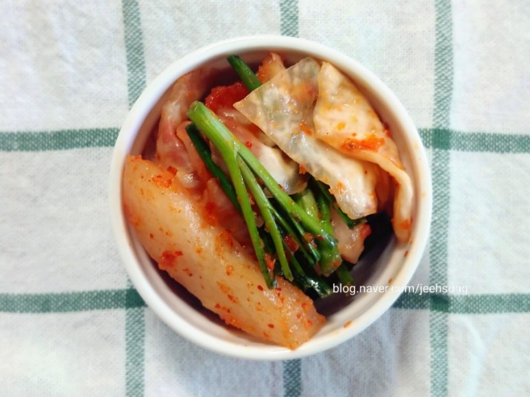 最後に、きれいに洗って3〜4cmの長さに切ったニラを加え、軽く全体を混ぜ合わせます。ニラの香りが加わることで、キムチの風味が格段にアップします。