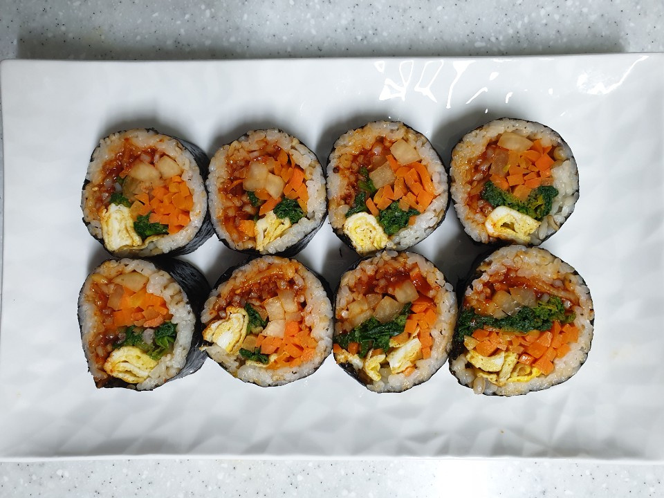 簡単なおかずとしても、しっかりとした一食としても素晴らしい、甘辛い切り干しイカのキンパをご紹介します。ご飯泥棒の切り干しイカと新鮮な野菜が調和し、食欲をそそる特別なキンパです。