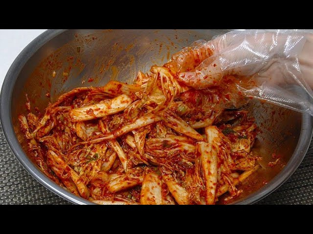 大きめのボウルに、下準備した白菜と長ネギを入れ、用意した調味料(唐辛子粉、砂糖、にんにくみじん切り、魚醤、エビの塩辛みじん切り、梅エキス、生姜みじん切り)をすべて加えます。優しく混ぜ合わせ、調味料が白菜全体に均一に絡むようにします。白菜のシャキシャキ感を保つために、あまり強く混ぜすぎないように注意してください。味見をして、お好みで魚醤や砂糖の量を調整してください。