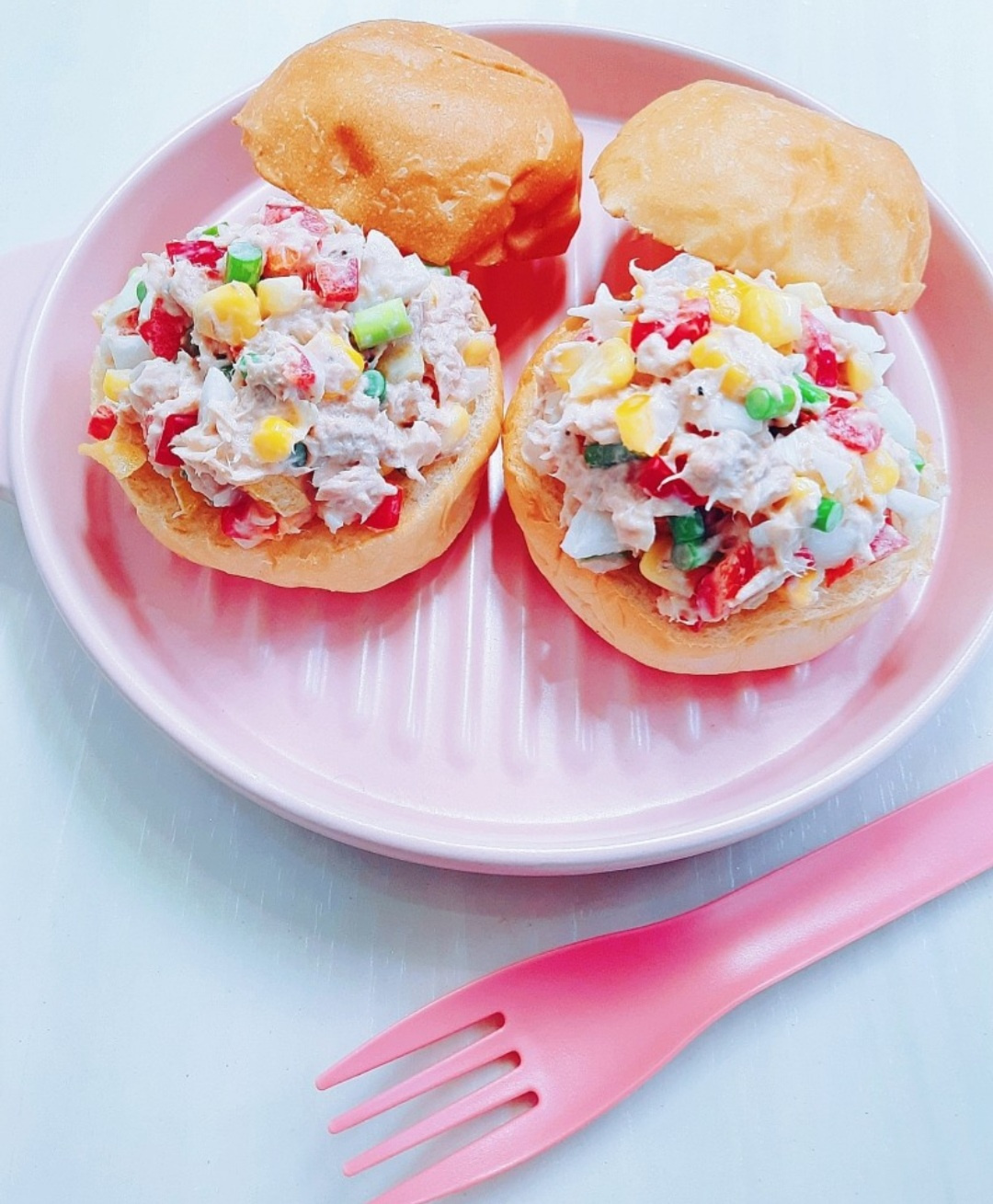 満足感のある朝食やおやつに!ツナマヨサラダをたっぷり詰めたロールパンサンドのレシピ