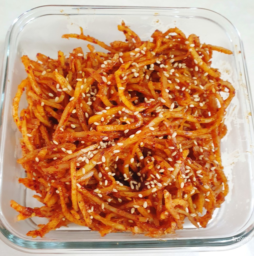 調味料が均一に馴染むように揉み合わせたチンミチェに、最後に炒りごまを振りかければ、ねっちり甘辛い国民食チンミチェポックンの完成です!すぐに食べても美味しいですし、お弁当のおかずや常備菜として数日間保存しても良いでしょう。どうぞお召し上がりください!