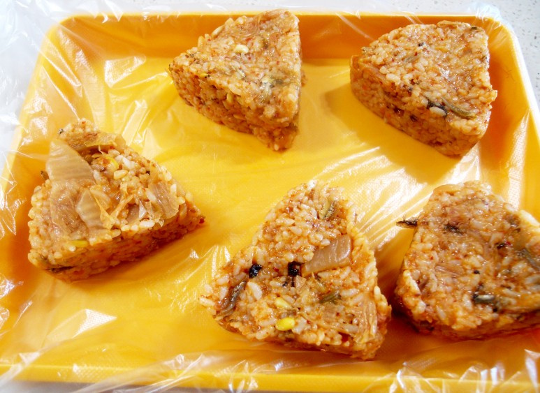 こうして出来立ての温かいおにぎりは、そのまま食べても美味しいです。豆もやしご飯、しいたけの佃煮、ツナキムチ炒めまで、冷蔵庫の材料をフル活用した超簡単「食品ロス削減」おにぎりが完成しました!