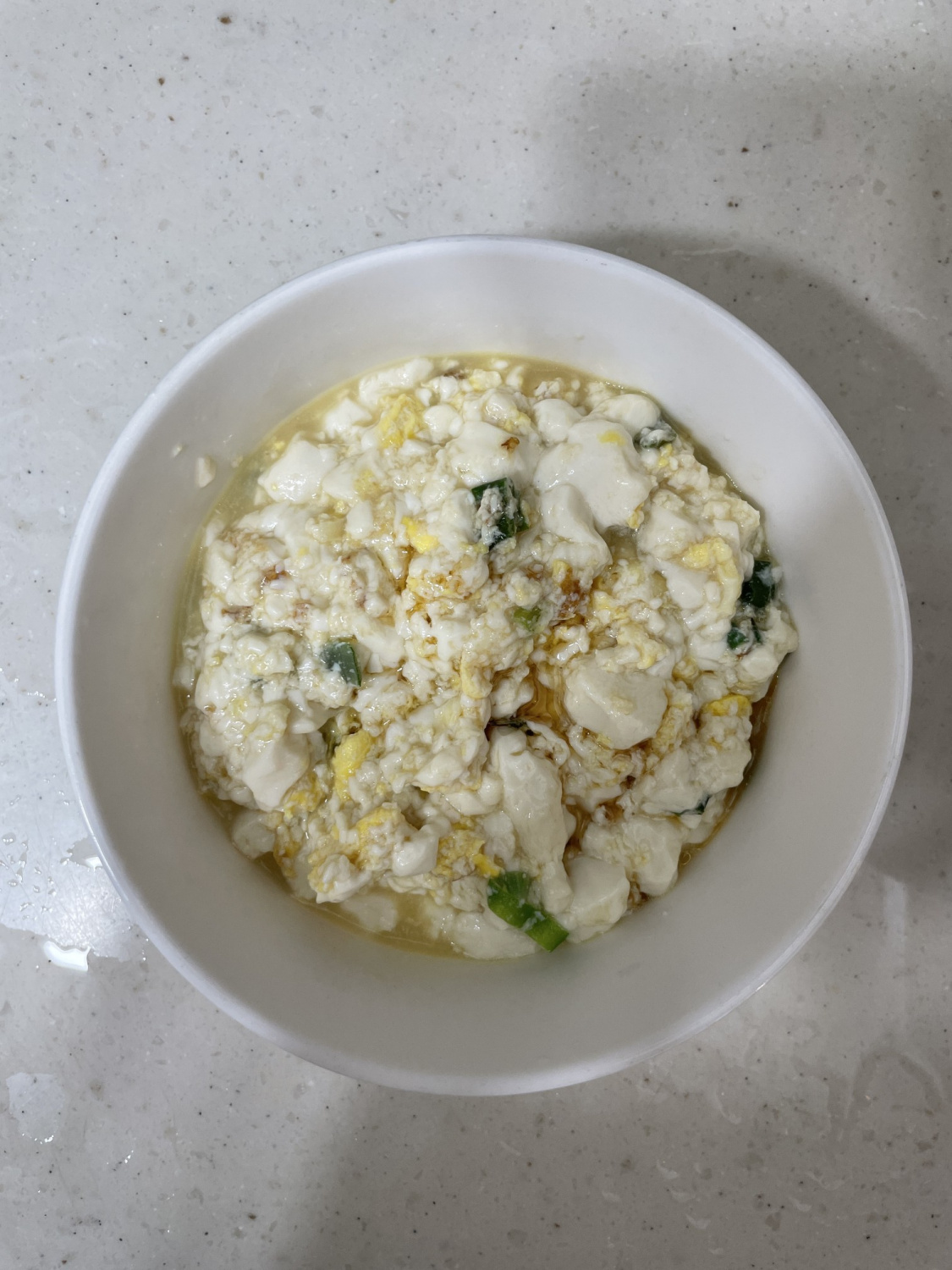 卵が7割程度火が通ったら、絹ごし豆腐半丁を大きめの塊のまま、または軽く崩しながら加えます。豆腐のなめらかさと卵のコクがなじむように、一緒に炒め合わせます。