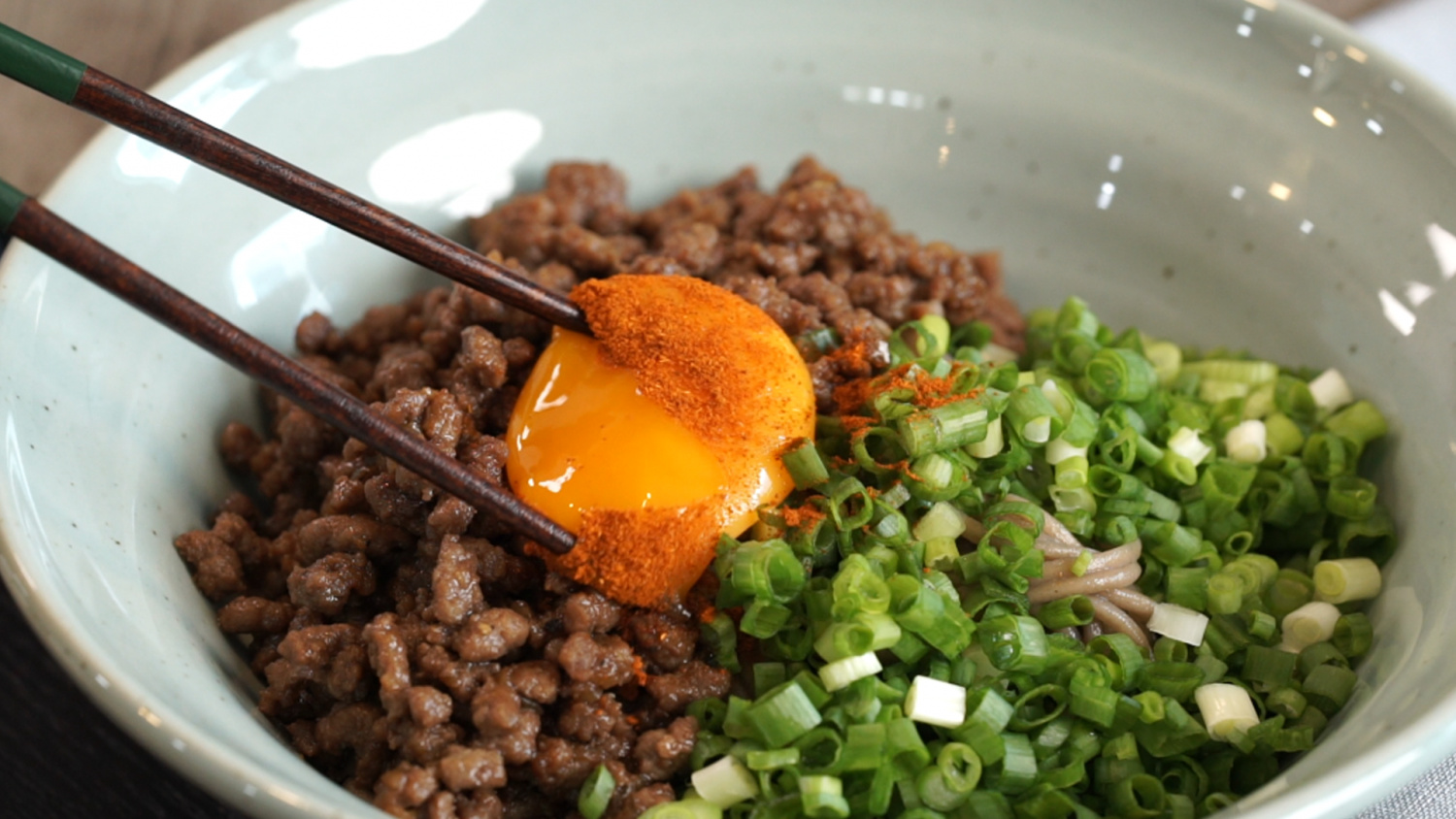 器に冷やしたそばを盛り付け、その上に準備した牛肉の炒め物と小口切りにした長ねぎをきれいに乗せます。最後に中央に卵黄を落とし、お好みでコチュジャンを振りかけたら、おいしい牛肉とそばのビビン麺の完成です!