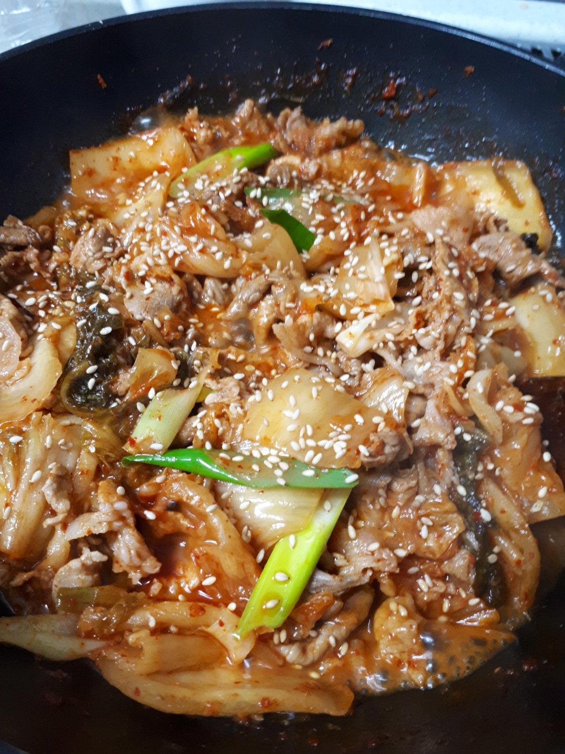 約7〜8分間、材料が美味しくなるまで炒めます。全体的に材料がよく炒まり、食欲をそそる色合いになったら火を止めます。最後に、香ばしさを加えるためのごま油と白ごまを振りかけたら、美味しい豚肩ロースのキムチ炒めの完成です!