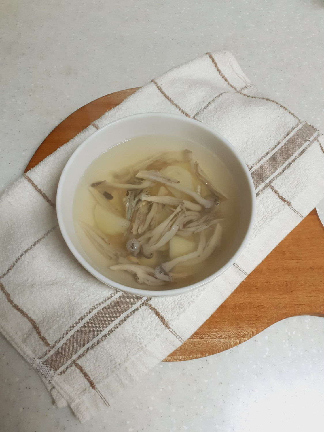 温かいじゃがいもスープを器に盛り付け、美味しく召し上がってください。この日は、蒸し器で大きな饅頭(マントウ)を蒸して、スープと一緒にいただきました。とても満足感があり、よく合いましたよ。お好みでネギや青唐辛子を加えても美味しいです。