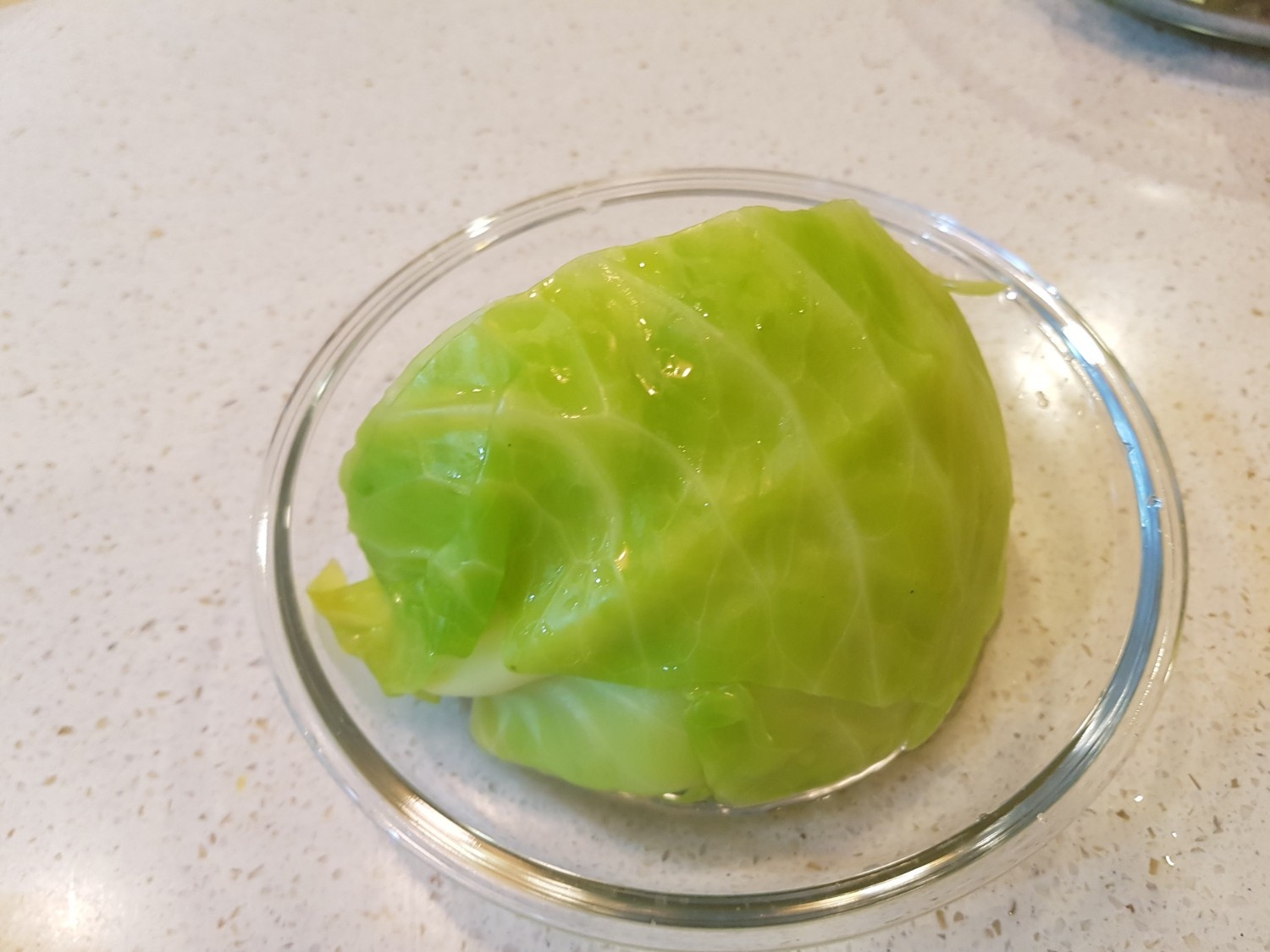 電子レンジ対応の、少し深めの耐熱容器にキャベツを切り口を下にして置きます。キャベツがしっとりと蒸されるように、底にキャベツが軽く浸るくらいの水(約1/2カップ)を注ぎ入れます。