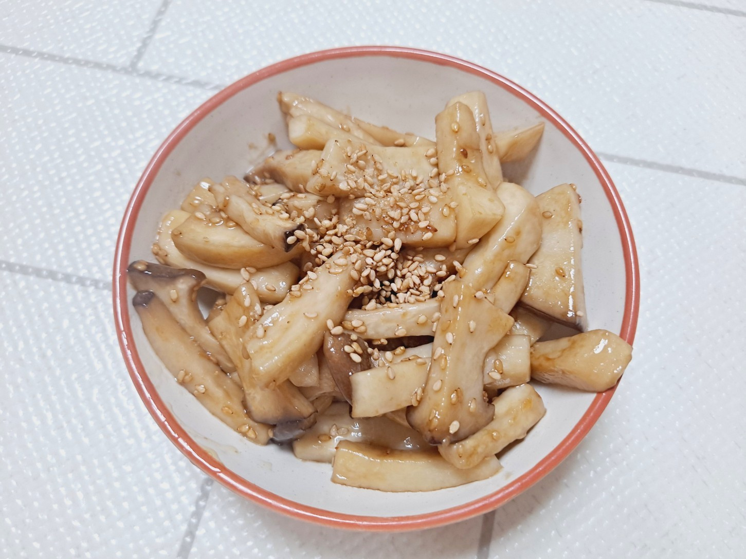 最後に、香ばしさをプラスする炒りごまを全体に振りかければ、美味しいキングオイスター(エリンギ)炒めの完成です!