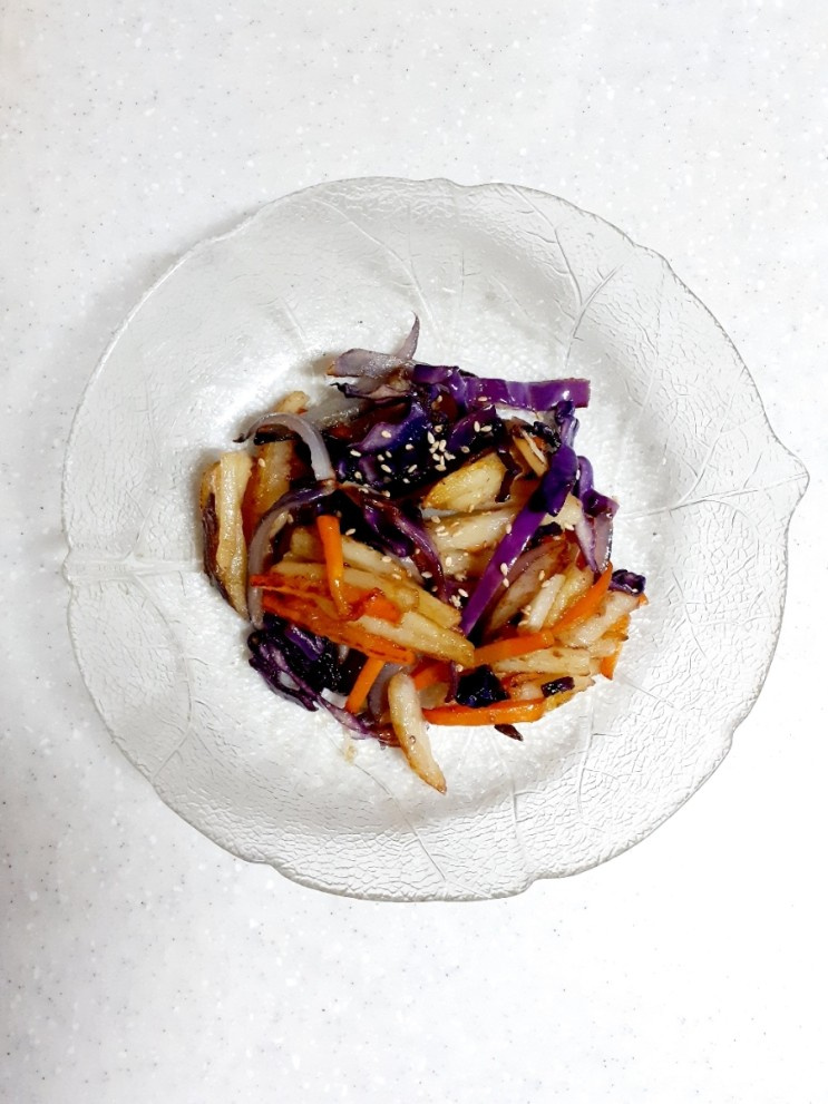 炒めて味付け:中華鍋や広めのフライパンにサラダ油をたっぷりひき、中強火で十分に予熱してください。予熱された油に、まず千切りにしたじゃがいもを入れ、こんがりとカリッとなるまで揚げ焼きのように炒めます。じゃがいもがある程度火が通ったら、残りの野菜(にんじん、キャベツ、玉ねぎ)に薄力粉大さじ1/2と片栗粉大さじ1/2を軽くまぶし、一緒にフライパンに入れて炒め合わせます。野菜がしんなりするまで炒めたら、準備しておいたオイスターソースと梅シロップを加え、全体に味が均一に絡むように味を調えます。最後に、食べやすい大きさに盛り付け、香ばしさを加える白ごまをパラパラとかければ、美味しいポテトチヂミの完成です!