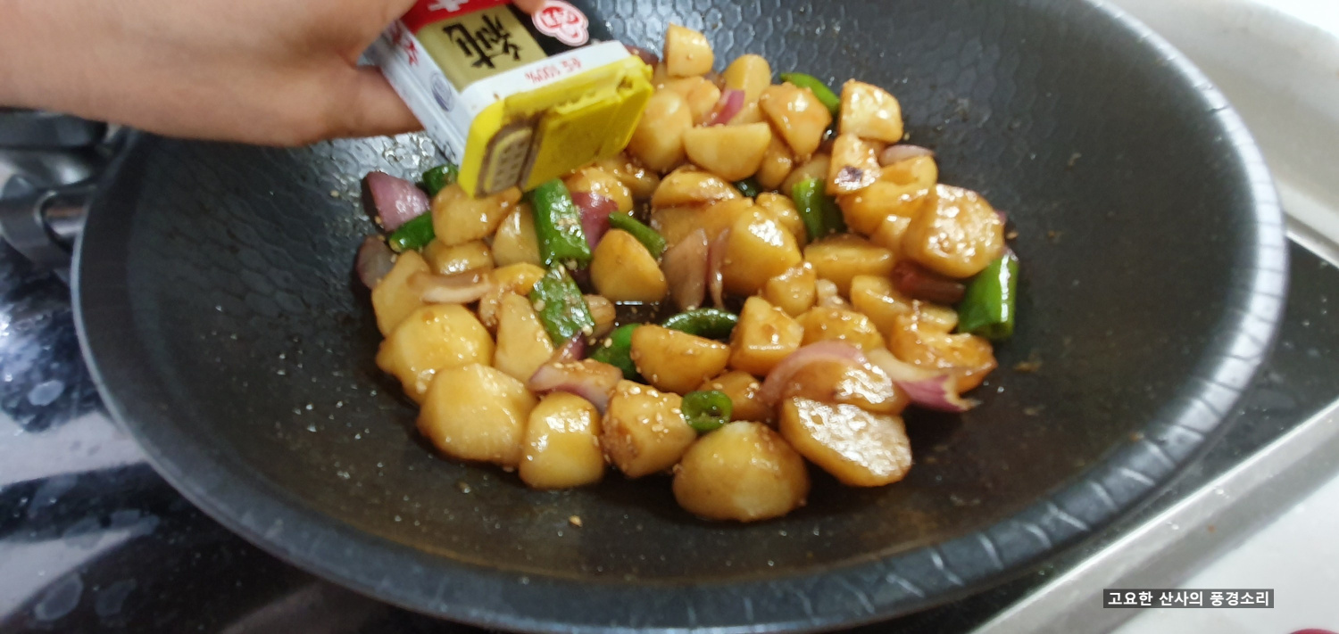 じゃがいもが軽く炒まったら、料理酒大さじ3、醤油大さじ2、米あめ(または水あめ)大さじ3を加え、調味料が全体に絡むようによく混ぜながら炒めます。タレが少し煮詰まってきたら、切っておいた玉ねぎと青唐辛子を加えて一緒に炒め合わせます。