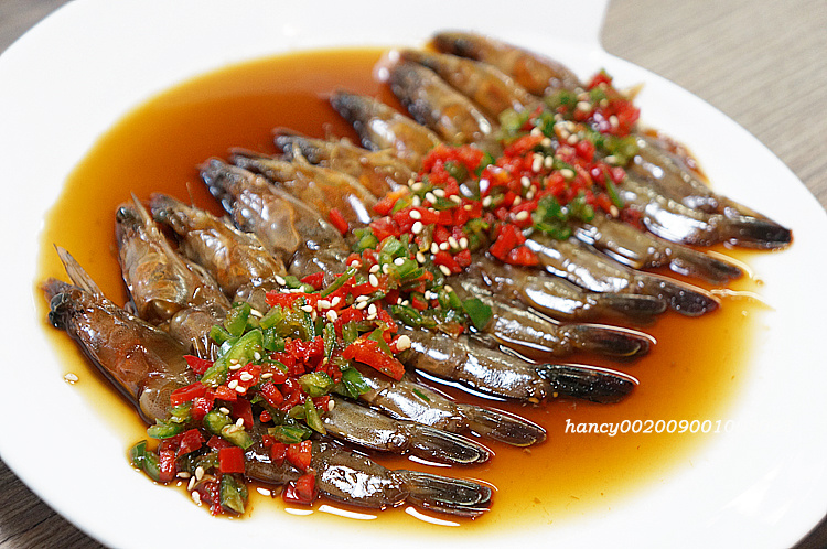 盛り付ける際は、斜め切りにした青唐辛子と赤唐辛子を彩りよく添えると、見た目も華やかになります。えびの頭は絶対に捨てないでください!頭の部分から濃厚な旨味が出るので、ぜひ一緒に味わってください。