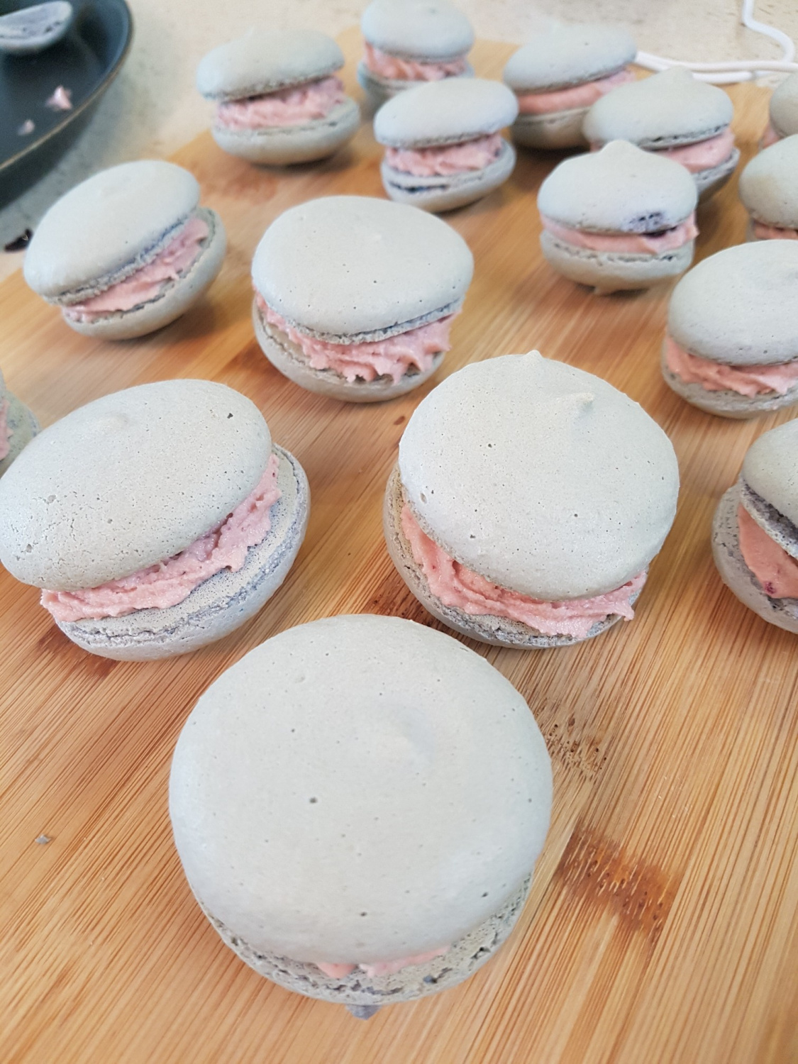9. 完成!:完全に冷めたマカロンコックに、準備したブルーベリーヨーグルトフィリングをたっぷり絞り、挟み込みます。コックとフィリングを合わせれば、美味しいブルーベリーヨーグルトマカロンの完成です!冷蔵庫で一晩置くと、コックとフィリングの味が馴染んで、より一層美味しくなります。