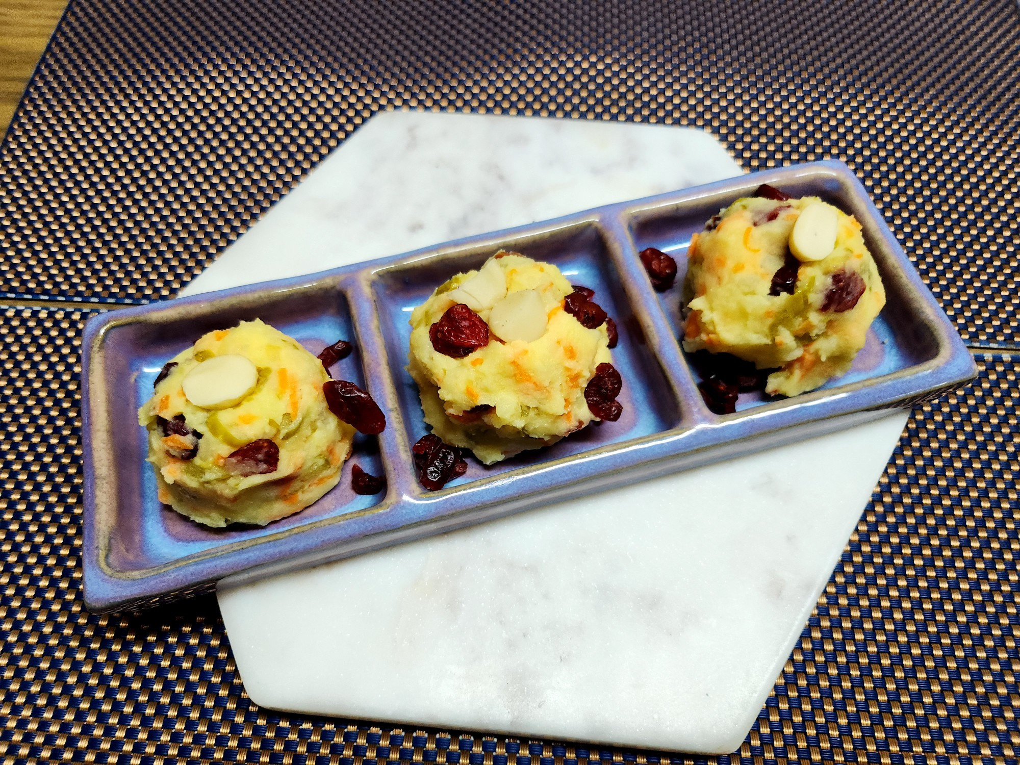 つぶしたじゃがいもに、細かく刻んだにんじんと用意したナッツ1/2カップを加えます。にんじんは彩りを添え、ナッツは食感と香ばしさをプラスしてくれます。