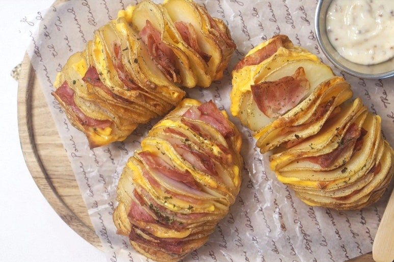 エアフライヤーで作るバター風味の丸ごとポテト焼き:お子様のおやつやビールのお供にぴったりのアコーディオンポテトレシピ