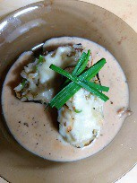 出来上がった詰め物焼きナスを器に盛り付け、ステップ6で作ったソースを添えて完成です。温かいうちに召し上がると、より一層美味しくいただけます。