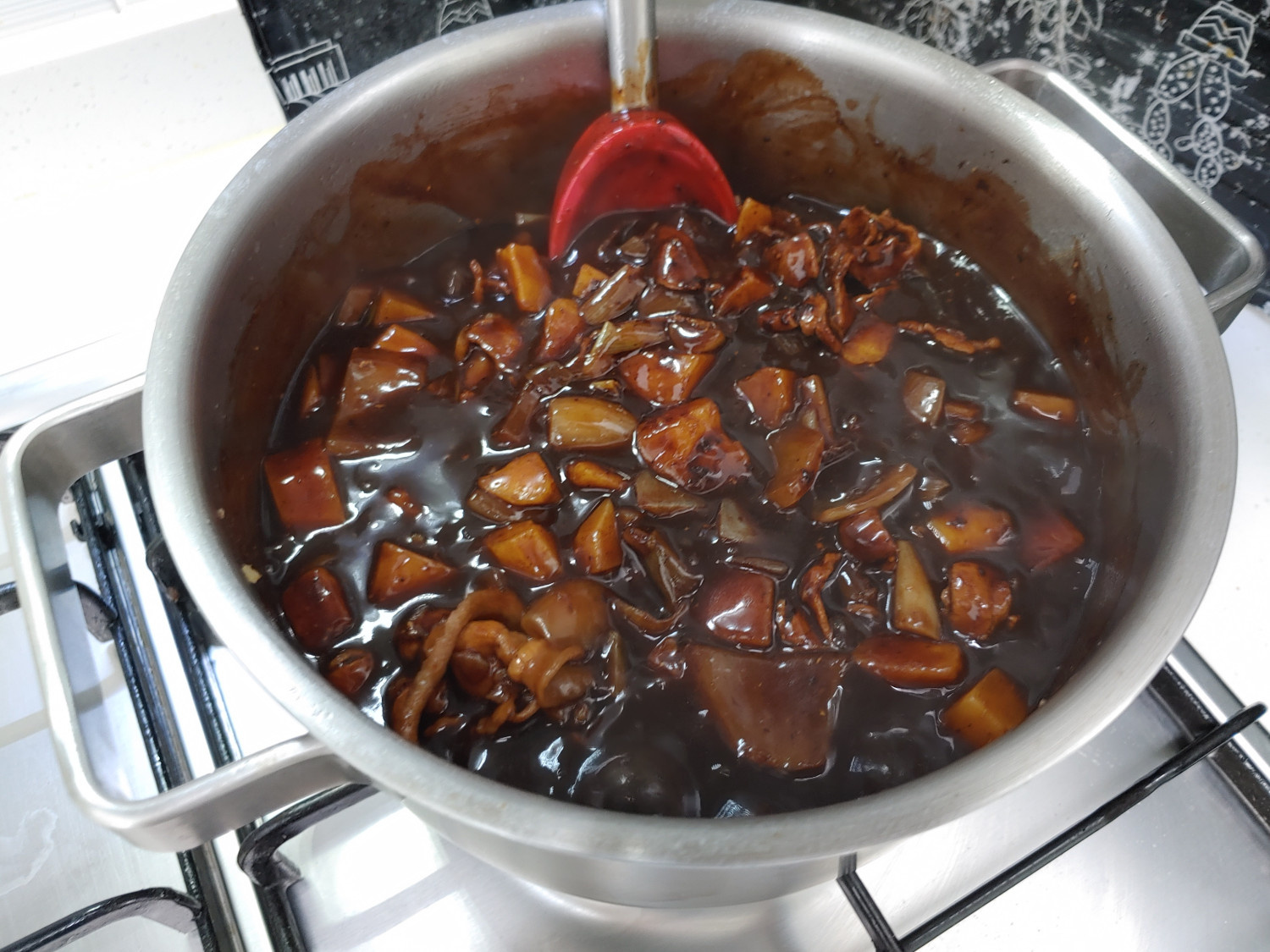 蓋をして中火にし、じゃがいもとさつまいもがフォークで刺して柔らかくなるまで約10〜15分煮込みます。煮込んでいる間に、鍋の上に浮いた余分な油はスプーンで取り除くと、よりすっきりとした美味しいちゃんぽんソースになります。