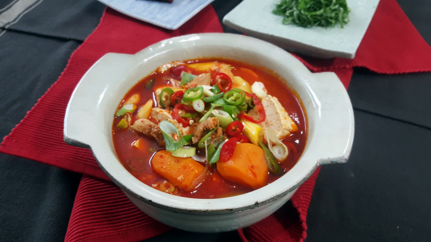 食欲をそそる!豚肉とじゃがいものピリ辛チゲで温まる家庭料理
