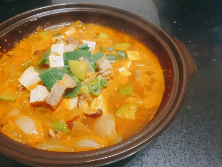 最後に、角切りにした豆腐と小口切りにしたねぎを加え、蓋をして余熱で軽く火を通します。豆腐が温まり、ねぎの香りが加われば、美味しい豚肉チャグリチゲの完成です!温かいご飯と一緒に、どうぞ美味しく召し上がってください。