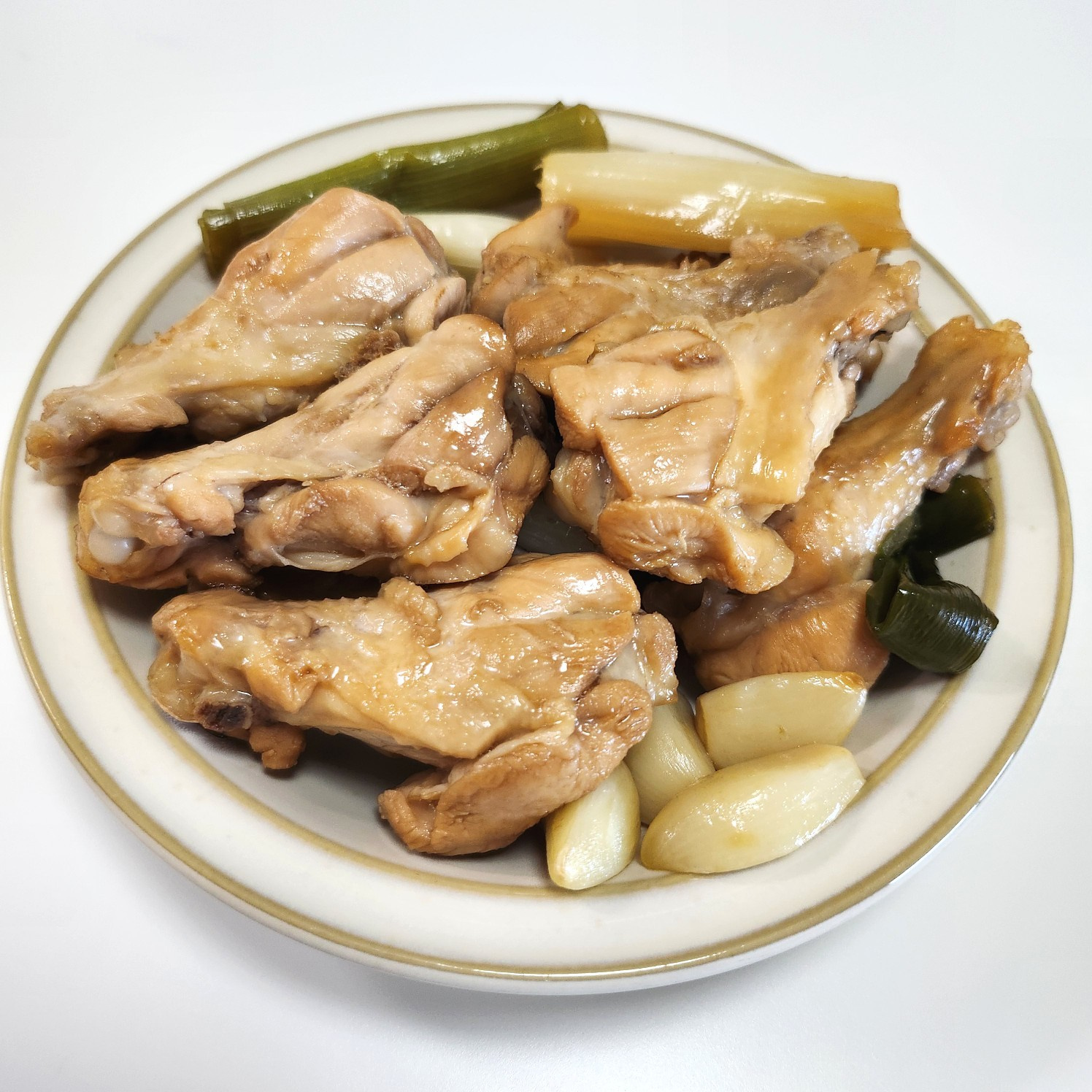 チキンドラムスティックを茹でている間に、副材料を準備します。長ネギはチキンドラムスティックと同じくらいの長さに大きめに切ります。ニンニクは皮をむき、きれいに洗って用意しておきましょう。ニンニクを丸ごと入れることで、煮込みだれの風味が良くなり、ほのかな甘みを出すのに役立ちます。