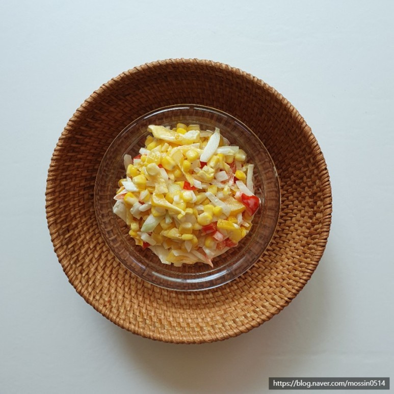 本当に簡単でしょう? これでサラダの基本の材料準備はほぼ終わりです。コーン、パプリカ、玉ねぎと、美味しいコーンサラダのための材料がすべて揃いました。