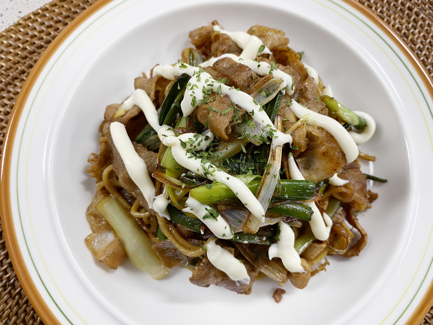 豚バラ肉がきつね色に焼けたら、刻んだ長ネギを加えて一緒に炒めます。ネギの爽やかな香りがお肉の脂と合わさって、さらに食欲をそそる香りが広がります。ネギが少し透明になり、しんなりする程度に軽く炒めるだけでOKです。炒めすぎると食感が悪くなるので注意しましょう。