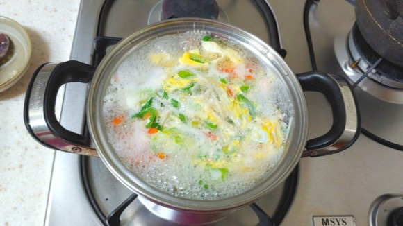 だし汁が再び煮立ったら、火を弱め、お玉やスプーンで溶き卵を回し入れるように、薄く流し入れます。この時、絶対にスープをかき混ぜないでください。そのまま卵が固まるのを待つことで、透き通ったスープを保つことができます。