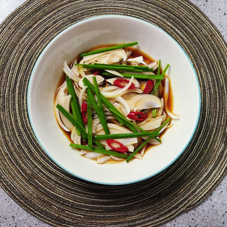 お皿や器に、準備しておいた千切り玉ねぎをきれいに盛り付けます。その上に、切ったニラを彩りよく乗せ、最後に飾り用の赤唐辛子を散らして色味を添えます。