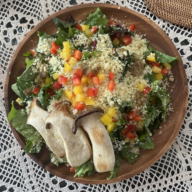 準備したサラダ野菜と冷ましたクスクスを大きなボウルに入れます。自家製ホールグレインマスタードドレッシングをかけたり、お好みのドレッシングを添えて、全体が均一に絡むように優しく混ぜ合わせたら、美味しいクスクスサラダの出来上がりです。グリルチキンやエビなどを加えると、さらにボリュームのある一食になります。