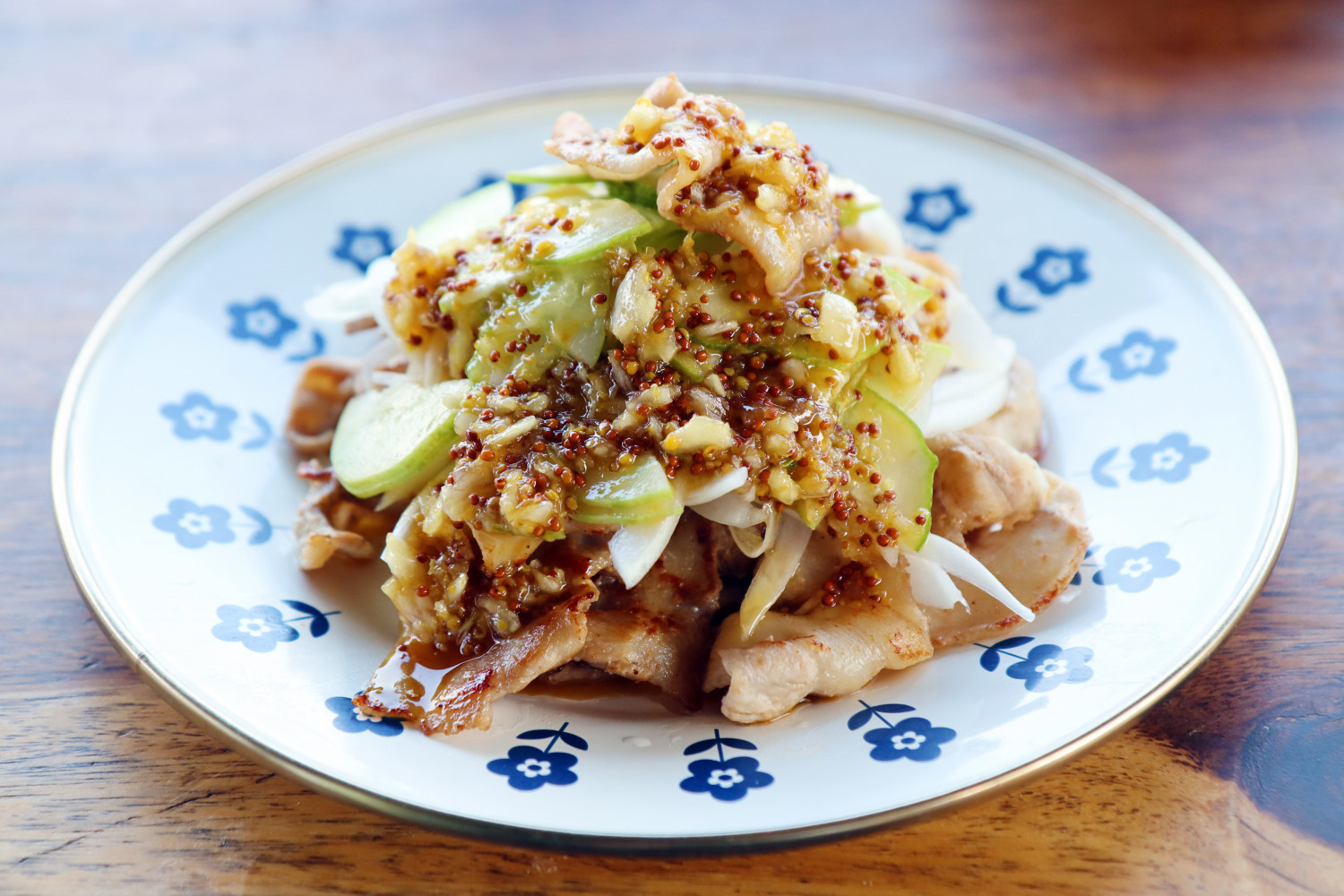 風味豊かな薄切り豚バラ肉のサラダ、爽やかなドレッシングで
