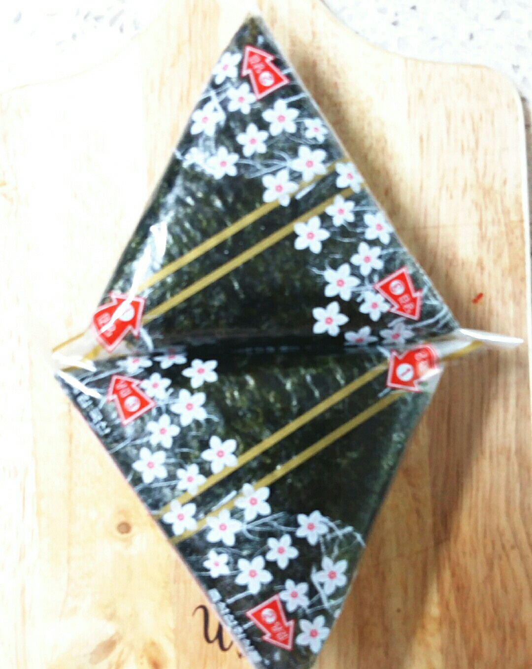 型から取り出したおにぎりを、三角おにぎり用の海苔の上に乗せます。海苔の両端を折りたたんで三角形を作り、側面もきれいに折りたたんでおにぎりの形を完成させ、シールを貼って仕上げます。