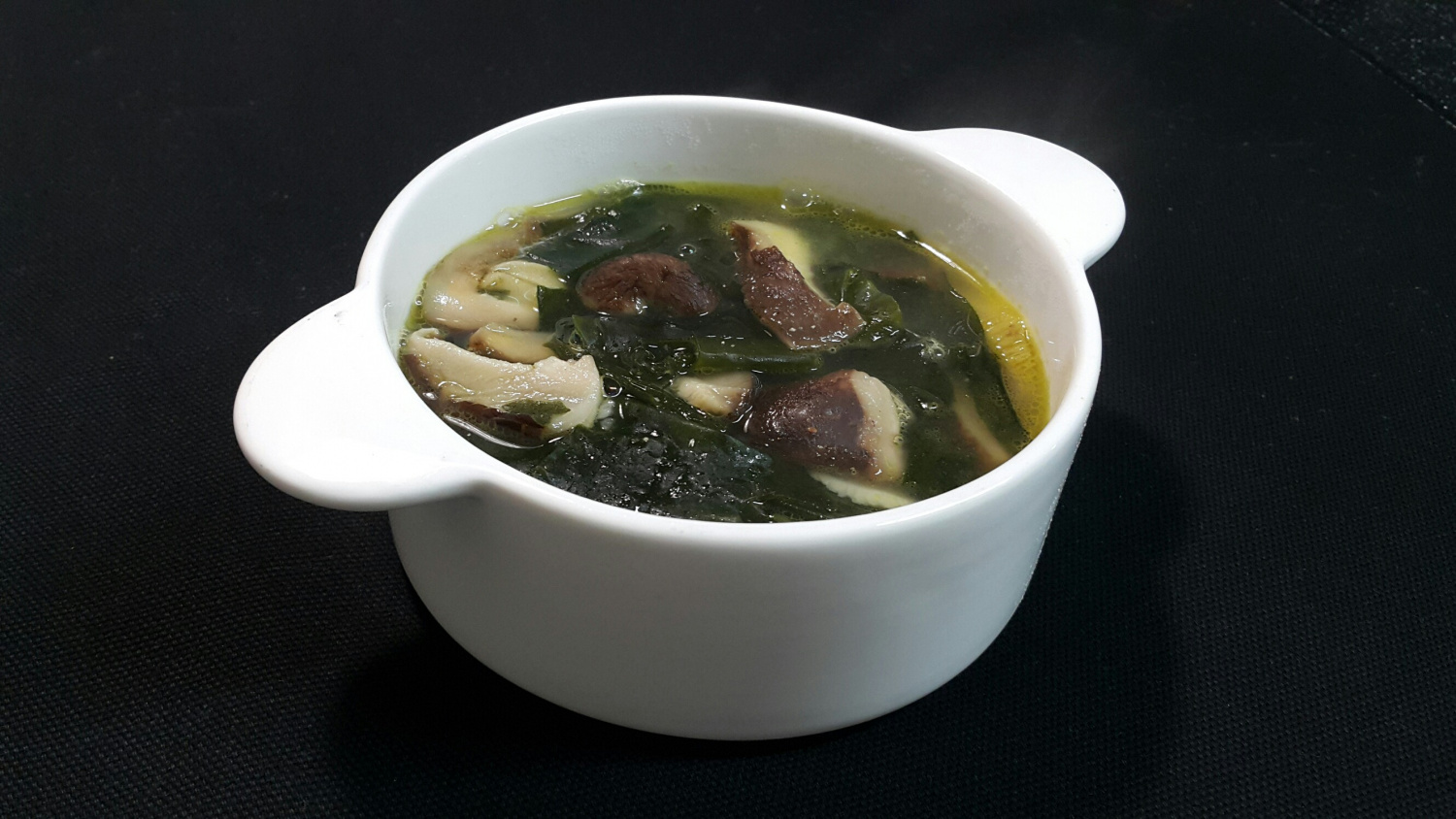 えごまパウダーを入れた後、弱火でさらに2~3分ほど煮込めば、香ばしくて栄養満点のしいたけとえごまの海藻スープの完成です。温かい内にどうぞ!