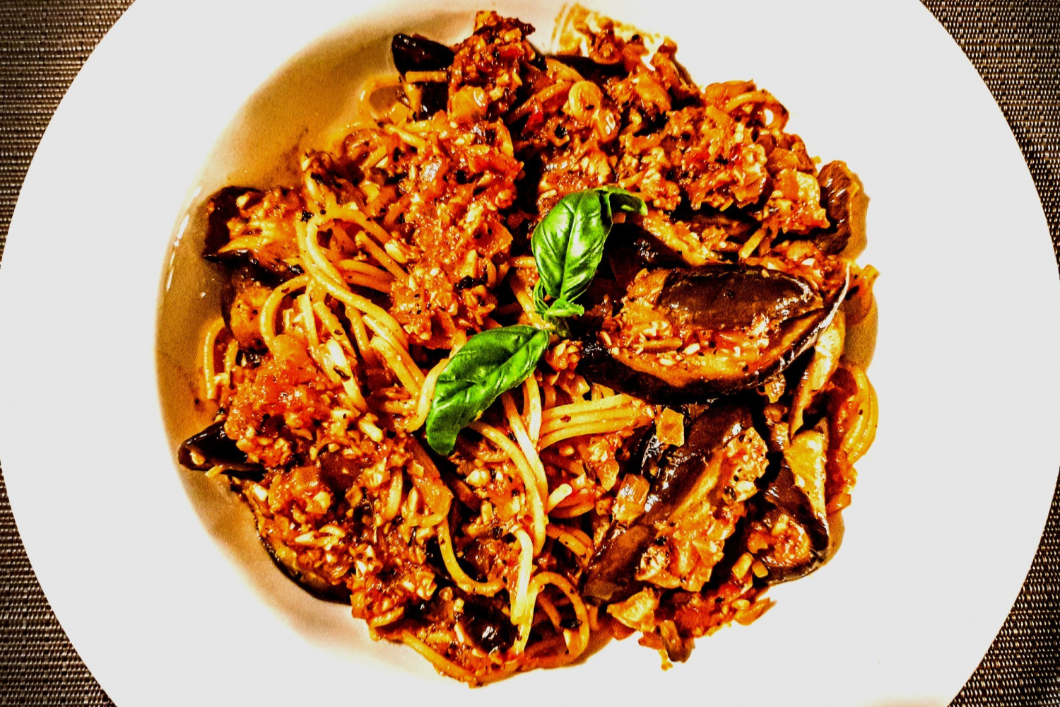 出来上がったナスとトマトのスパゲッティを、美しいお皿に盛り付けます。最後に新鮮なバジルの葉を数枚飾ると、見た目も味も素晴らしいパスタが完成します。どうぞ召し上がれ!