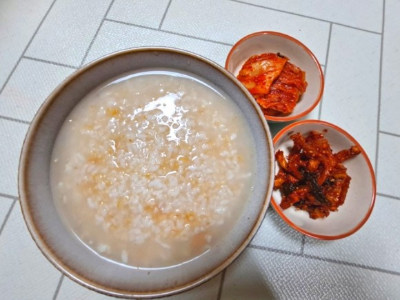 朝食にぴったりな、胃に優しい香ばしいおこげスープ!温かく香ばしい風味がたまりません。さらに、カリカリのたくあん(ムマレンギ)やパリパリの味付け海苔(チョミギム)を添えると、さらに美味しくいただけますよ!