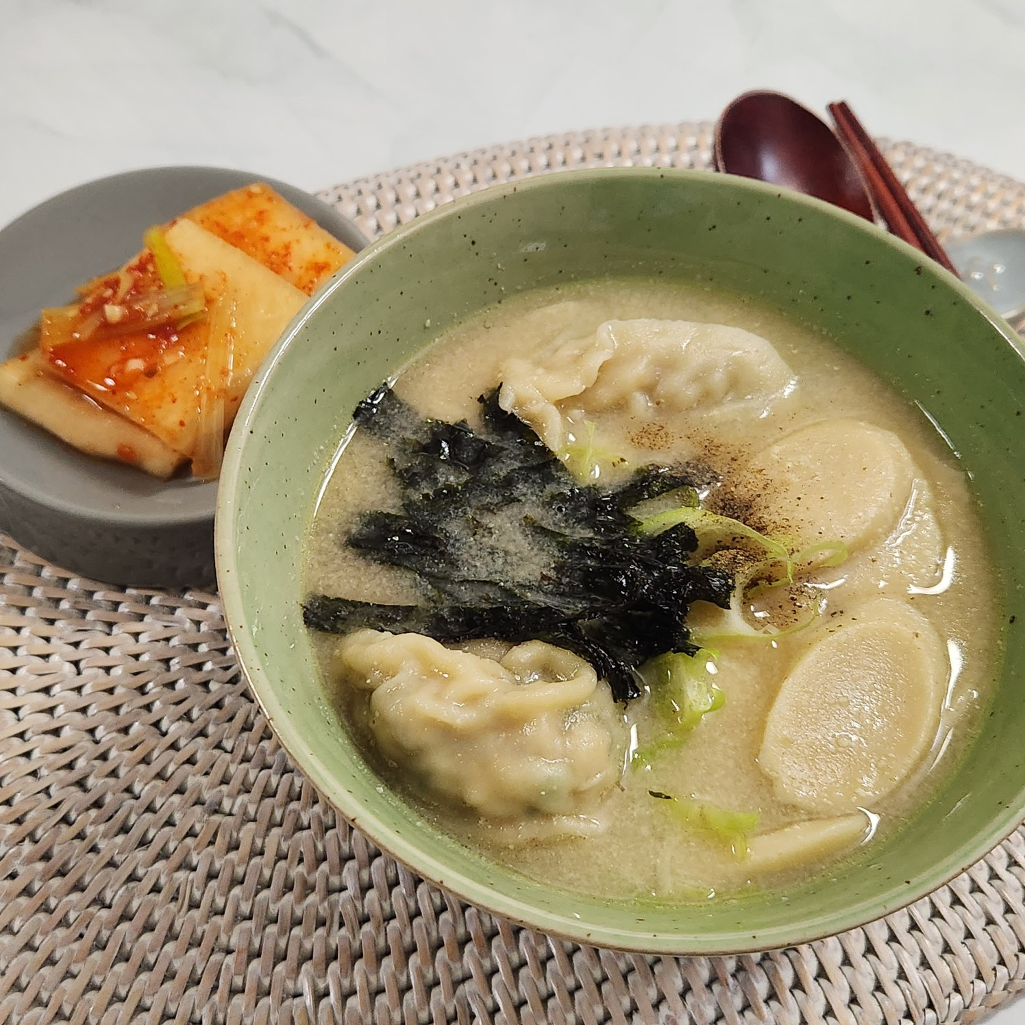 出来上がったトック・マンドゥグクを、美味しそうな器に盛り付けます。準備しておいた味付け海苔の飾りと、軽くこしょうを振ると、さらに食欲をそそります。熱々で香ばしいスープの味と、もちもちとした玄米トック、そして柔らかいマンドゥの組み合わせは格別です。ご家族皆様で楽しめる美味しいトック・マンドゥグク、ぜひ作ってみてください!