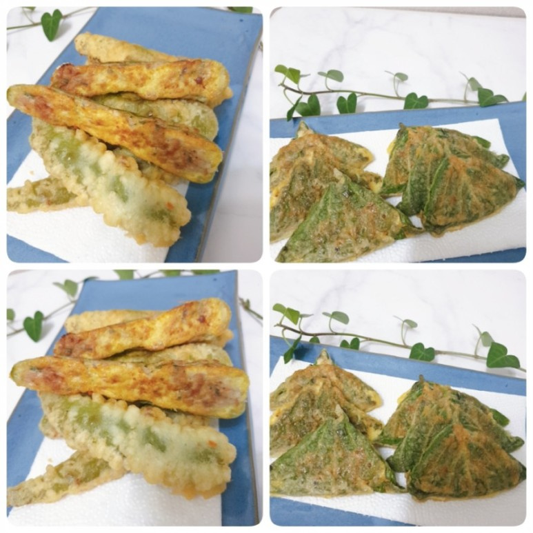 よく混ぜた生地を準備します。ピーマンの内側に、生地をたっぷりと押し込むように詰めます。エゴマの葉の場合は、茎の部分の下の広い面に生地を薄く広げ、その後、エゴマの葉を半分に折りたたんで具材を包みます。両端の角を少し寄せると、自然に三角形になります。(動画での説明がないため分かりにくいかもしれませんが、もし難しければ、エゴマの葉の半分にだけ生地を乗せて半分に折るだけでも簡単に作れます。)