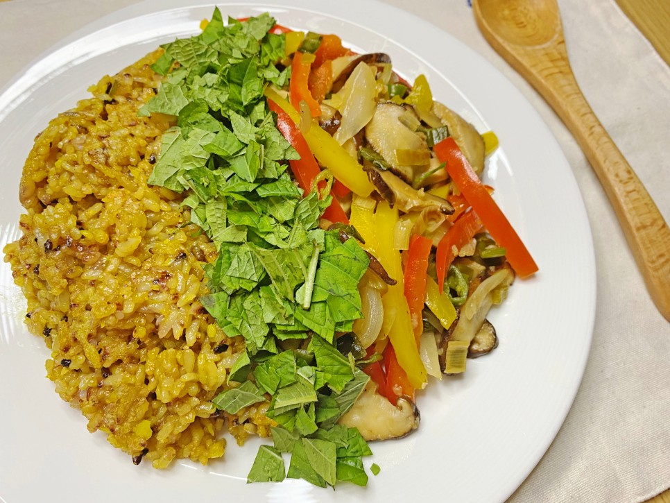 最後に、細かく刻んだ大葉をカレーチャーハンの上に散らすと、爽やかな香りと新鮮さが加わり、見栄えも良く仕上がります。見た目も美しく、味も美味しいカレーチャーハンとパプリカときのこの炒め物を、どうぞお楽しみください!