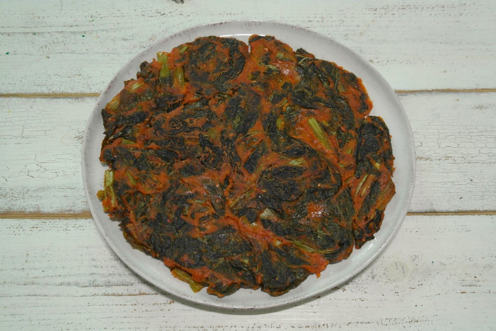 熱したフライパンに多めの油をひき、作ったマスタードキムチの生地をお玉一杯分ほど取って薄く広げます。マスタードキムチチヂミは薄く焼くことで、中までしっかり火が通り、食感がパリッとしてより美味しくなります。中弱火で片面がきつね色に焼けたら裏返し、もう片面も同様にこんがりと焼き上げてください。両面がカリッと香ばしく焼けたら、風味豊かでピリ辛なマスタードキムチチヂミの完成です!温かいうちに召し上がると、さらにおいしくいただけます。