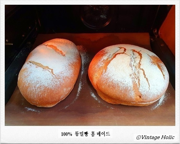 最後に、表面に軽く打ち粉を振り、200℃に予熱したオーブンで25分間、こんがりと焼き上げれば、美味しい全粒粉パンの完成です!