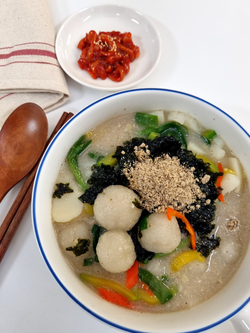 じゃがいものニョッキが鍋の表面に浮かんできたら、火が通った合図です!ここで、切ったズッキーニと赤唐辛子を加え、さらに約5分煮込みます。次に、だし醤油大さじ2を加えて、スープの味のベースを作ります。