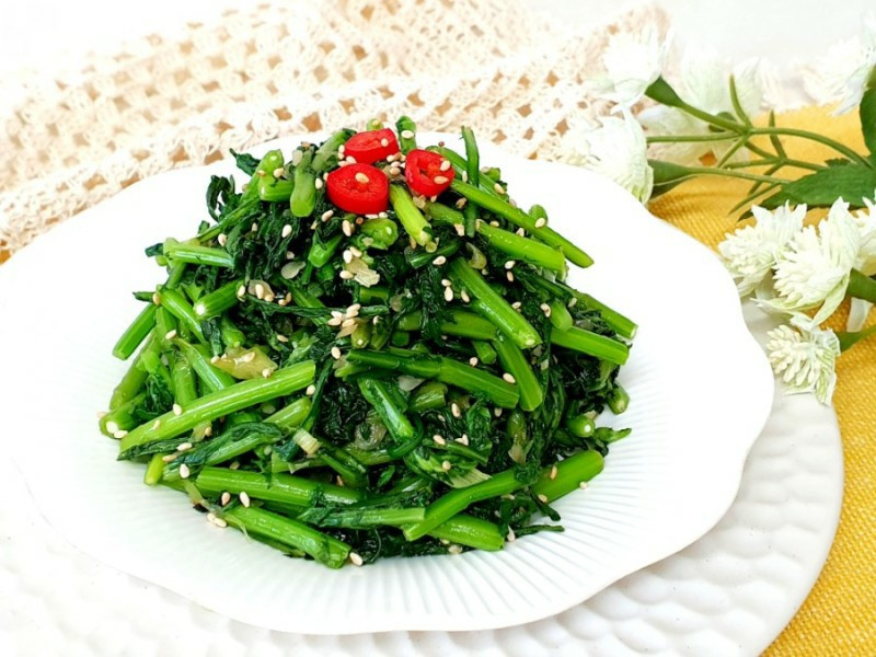 最後に、香ばしい炒りごまをたっぷり振りかけたら、香り豊かなヨモギのナムルの完成です!見た目も味も良いヨモギナムルで、食卓を彩ってみてください。