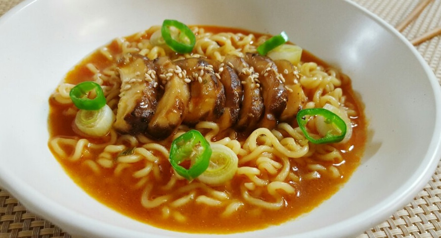 7. 香り高い椎茸ラーメンを、どうぞ召し上がれ!:深い椎茸の香りとピリ辛の風味が満載の椎茸ラーメンが完成しました。温かいうちに、ずるずると美味しくお召し上がりください!