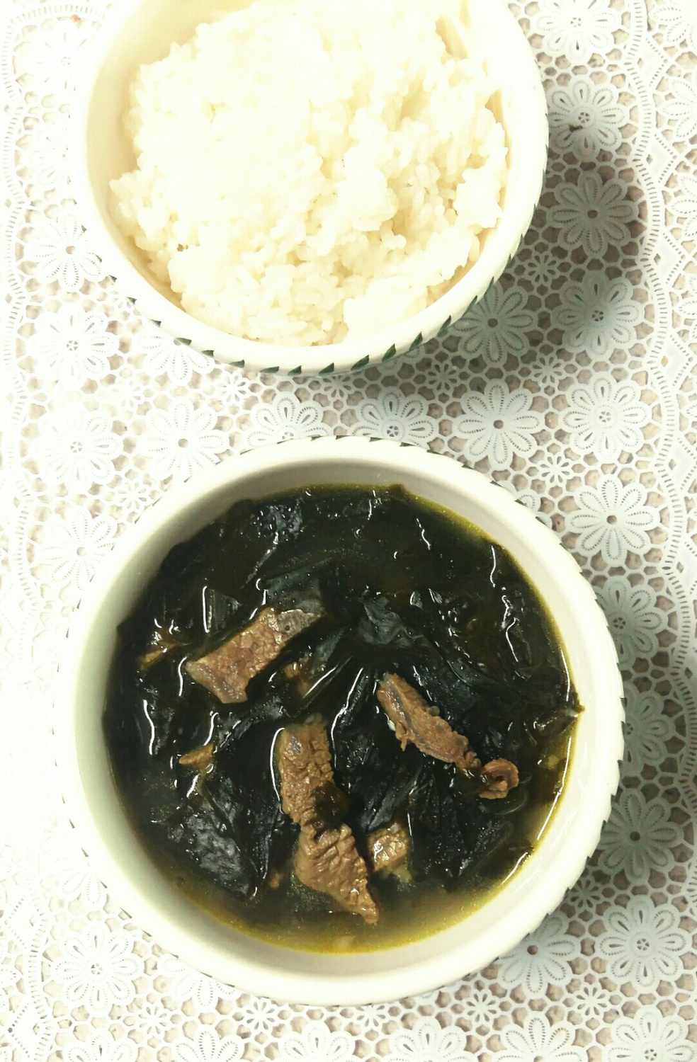 温かく煮上がった韓牛サーロインわかめスープを、器に美しく盛り付けたら完成です。炊きたての温かいご飯と一緒に、美味しくお召し上がりください!