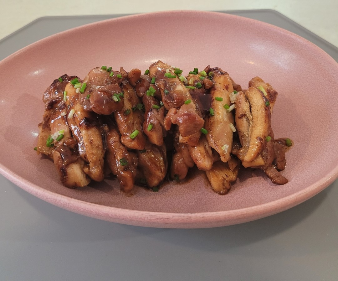 ソースが美味しく煮詰まり、鶏肉に艶やかに絡んだら火を止めます。フライパンから取り出し、食べやすい大きさにハサミや包丁でカットします。お好みで刻んだ小ねぎを散らすと、彩りも良く、さらに風味豊かになります。熱々をどうぞ召し上がれ!