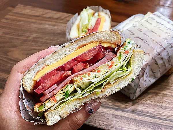 一口頬張れば、シャキシャキとしたレタスとトマトのみずみずしさ、ふわふわの卵、香ばしいチーズとハム、そして甘いソースが一体となり、驚くほどの味のハーモニーが広がります。バターで焼いたパンの風味と、それぞれの具材の調和が絶妙です。本当に満足できる美味しさでした!